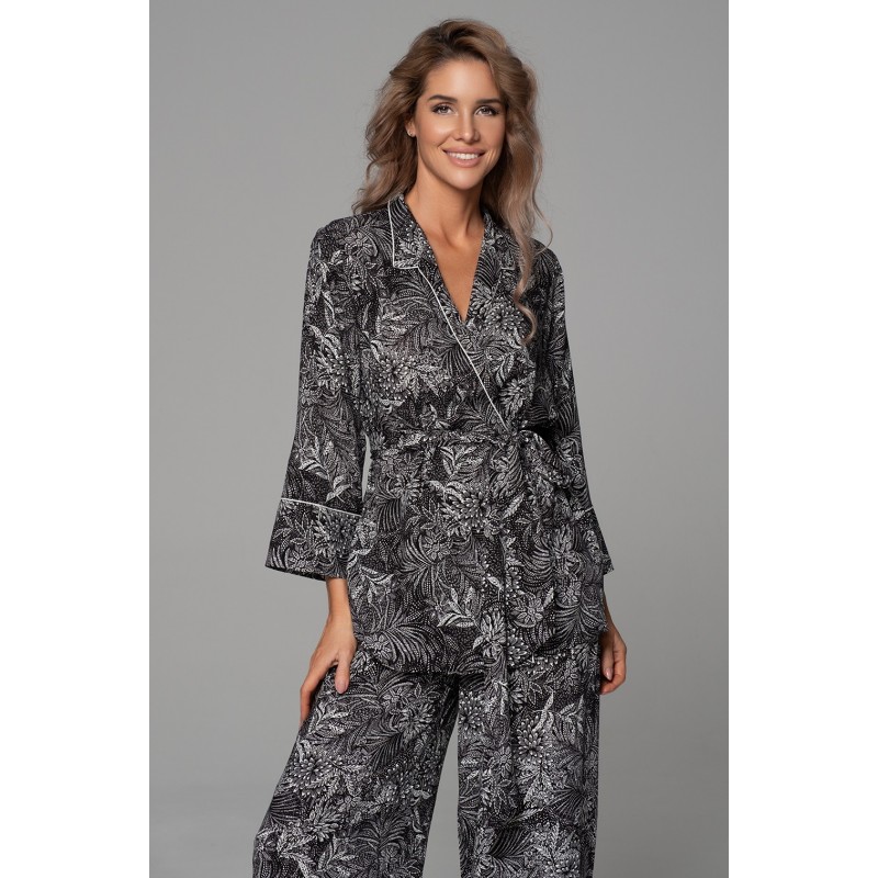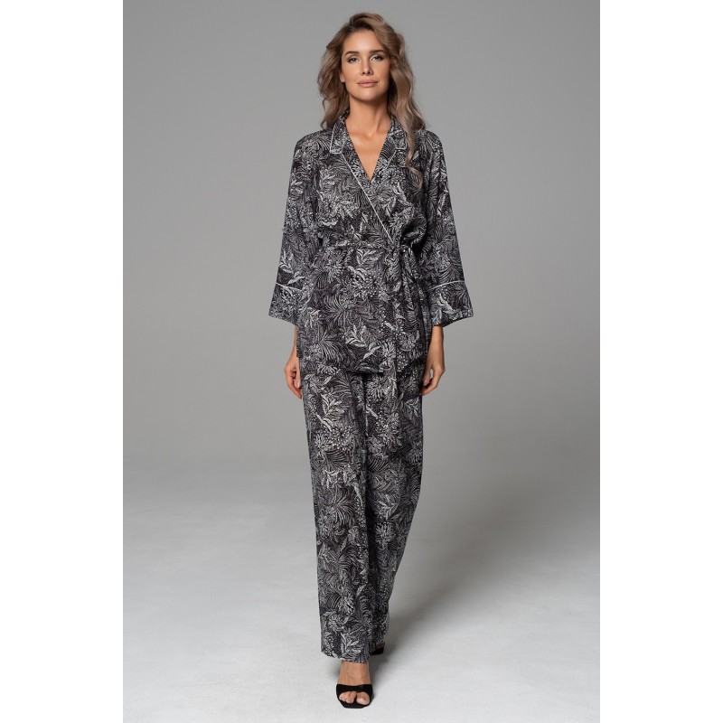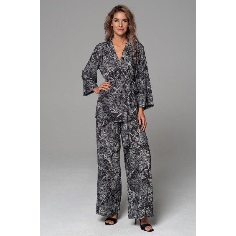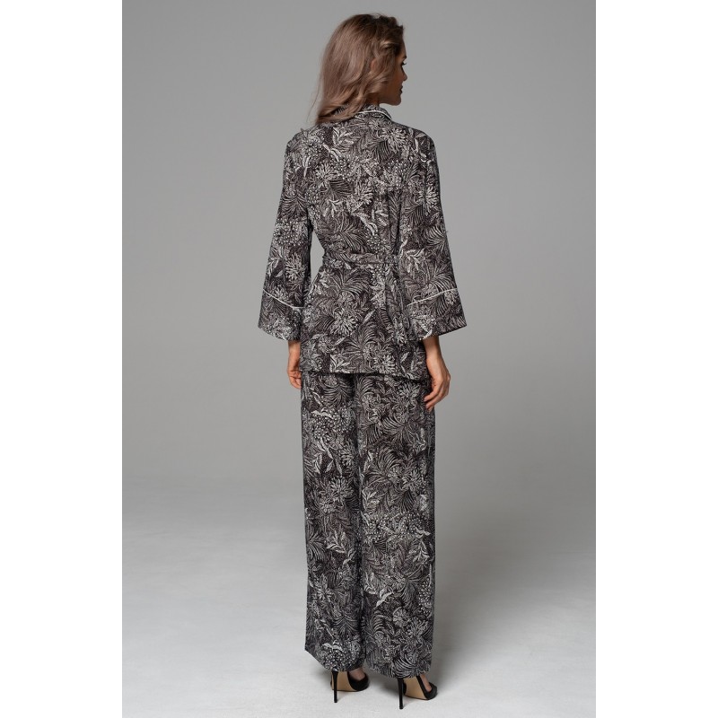 Описание: Пижама состоит из жакета с длинным рукавом и широких брюк - палаццо.  Изделие выполнено из тканой принтованной вискозы с контрастным кантом по линии борта и низу рукавов. Линию талии можно подчеркнуть за счет  пояса, который идет в комплекте.
