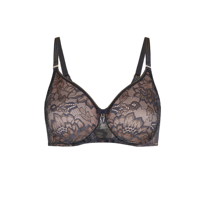 Бюстгальтер с мягкой молдированной чашкой на косточках. Внутри чашка дублирована микрофибры. Бретели отстегиваются спереди. Верхний край чашек по линии декольте декорирован эластичной тесьмой с вплетением металлизированной нити цвета rose gold. Боковые детали из кружева на подкладке для дополнительной поддержки. Круглая комфортная спинка. Широкий размерный ряд, бюстгальтер прекрасно подойдет обладательницам пышных форм.