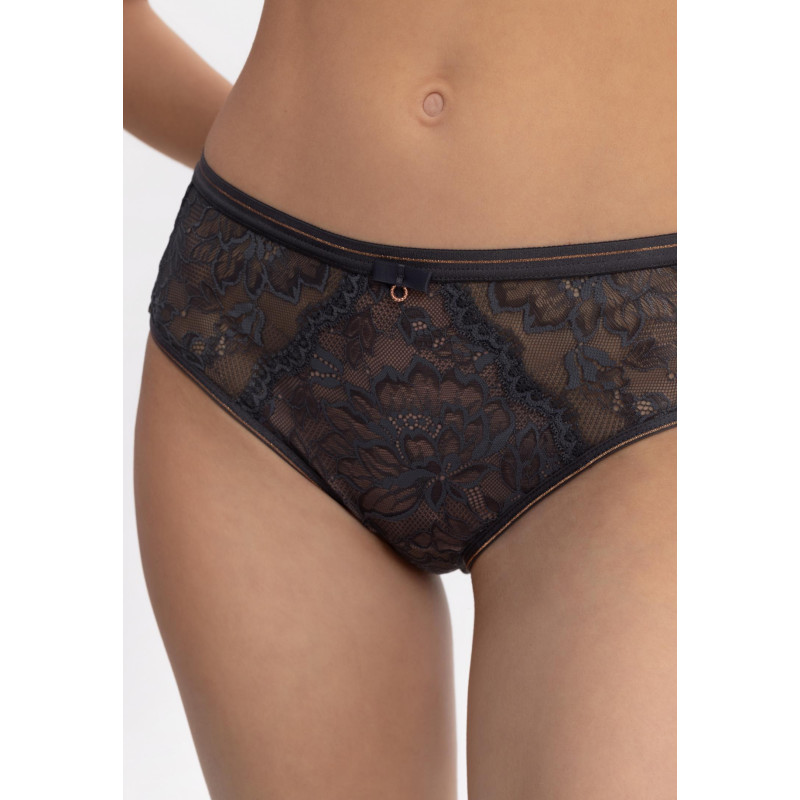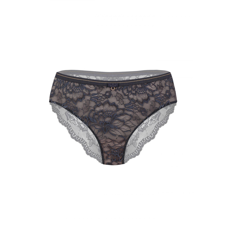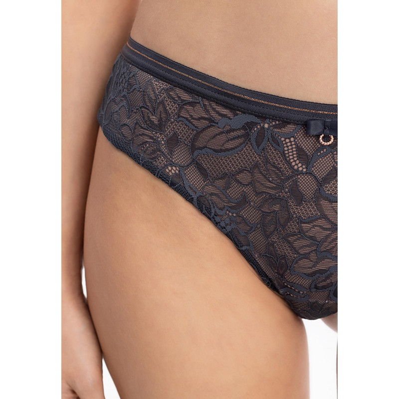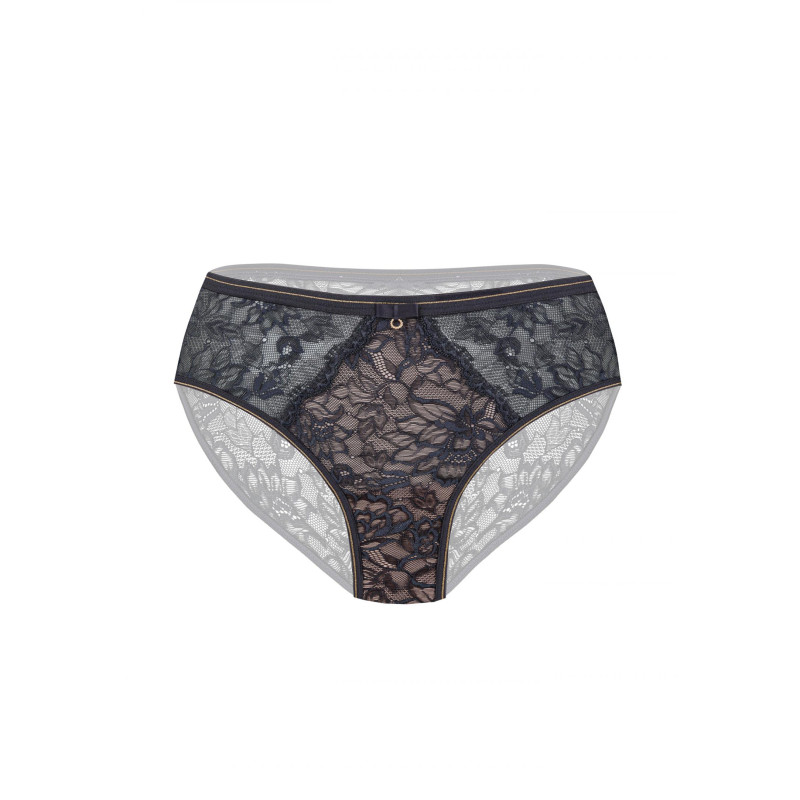 - кружевные трусы-бразилиана со средней посадкой (W25-0693-02-BZO-LZ). Мягкий пояс из эластичной тесьмы украшен золотой нитью. Передняя деталь