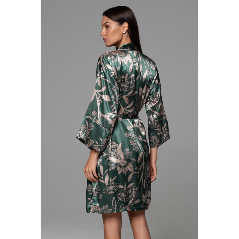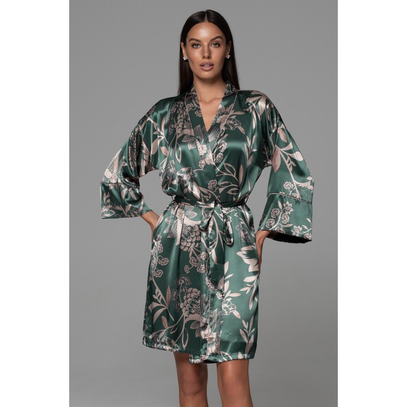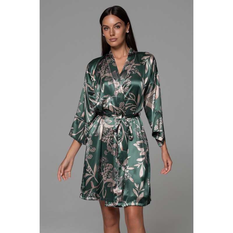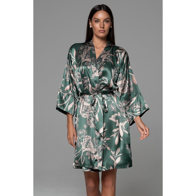 Короткий халат–кимоно Mia-Amore выполнен из принтованного смесового шелка. По бокам расположены карманы. В комплекте идет пояс,